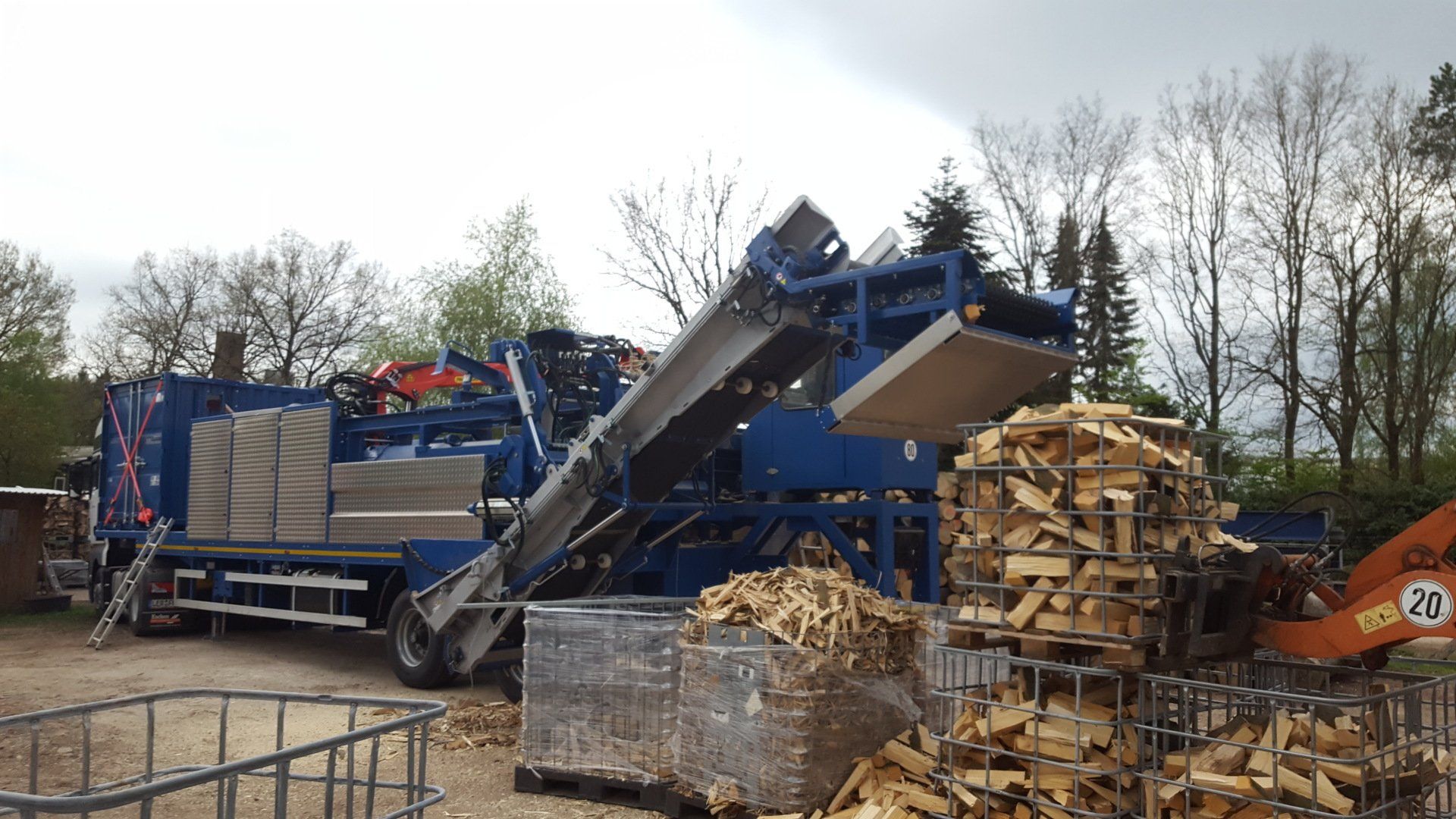 +++Nach dem Spalten wird ihr Kaminholz gesiebt und mit einem Förderband abtransportiert .z,b in Gitterboxen. +++